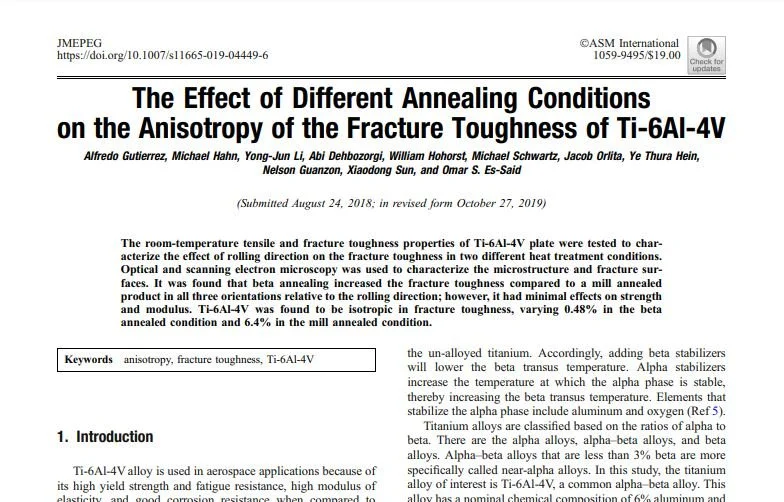 A research paper that studied the effects of polishing direction on the fracture toughness in two different heat treatment conditions for the titanium alloy Ti-6Al-4V.