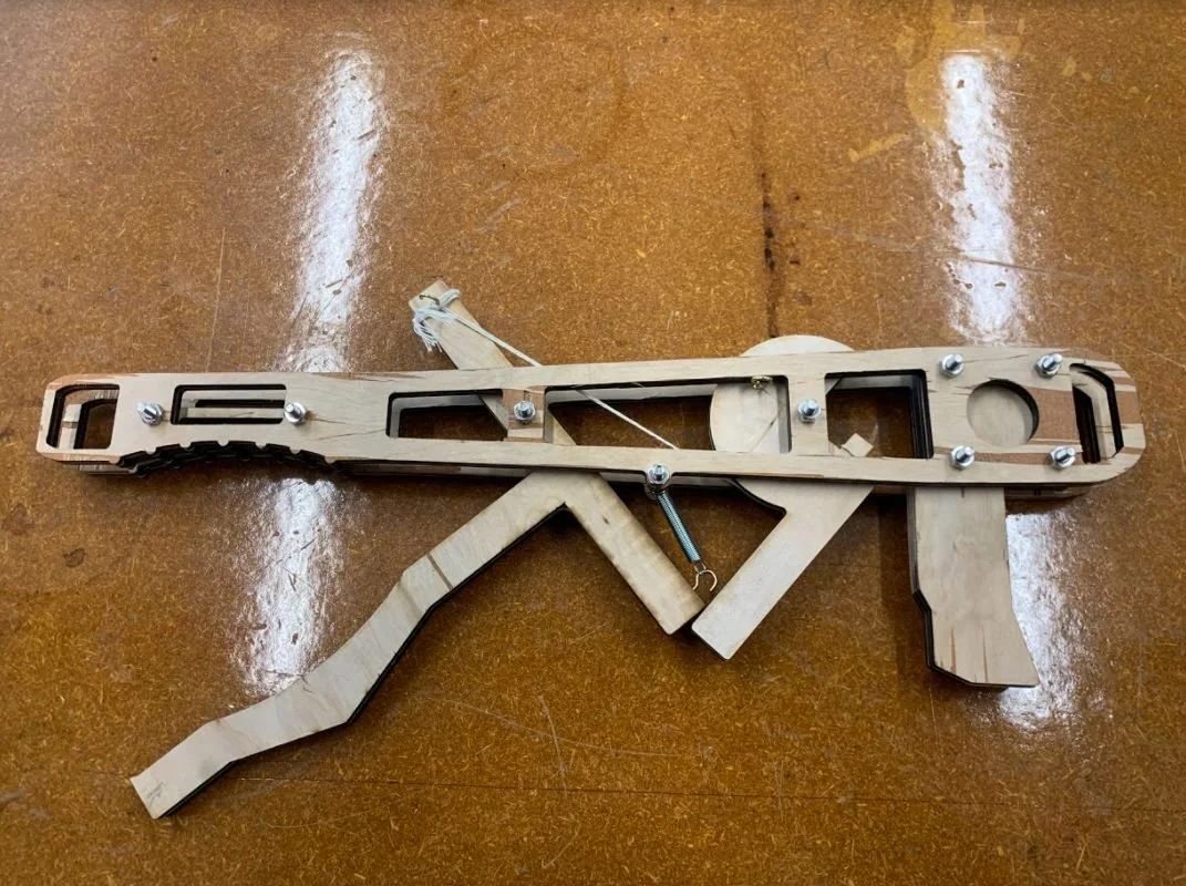 A soda can grabber where the components were manufactured using a laser cutter.